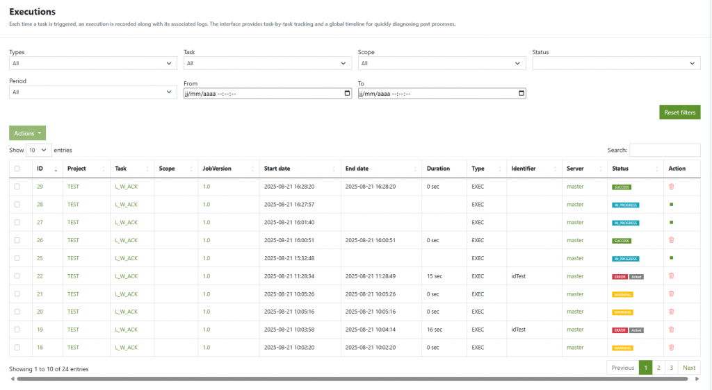 - Global list filters: Type (trigger source), Task, Scope, Period or From/To, Status + free-text Search.