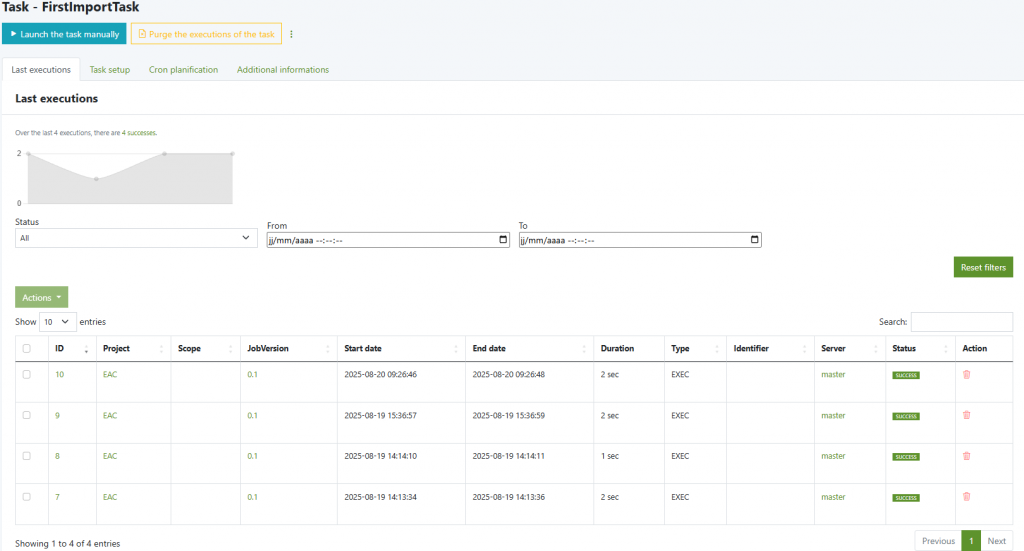 - Filters: Scope, Last exec. status, Context, Period (From/To).