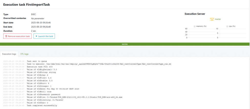 | JVM parameters | Memory settings used by the job runtime. | Shown (e.g., -Xms256M -Xmx1024M). | Comes from the job. To change, edit the job/version, not the task. |