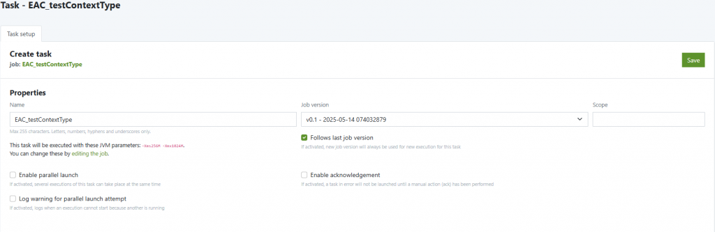 - Then in Task setup, choose Job version, select a Context (see Contexts), optionally enable context overloading and add overrides.