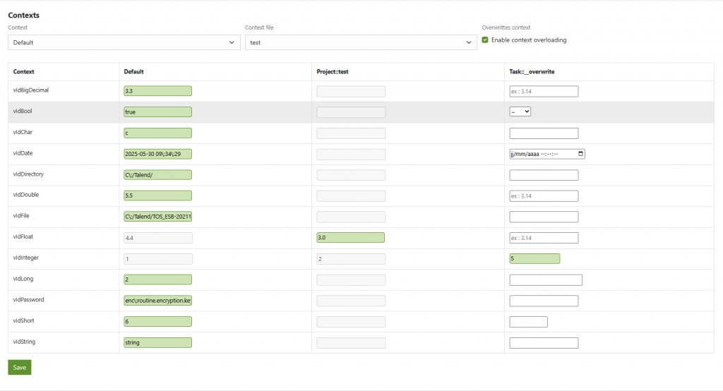 Each task exposes all contexts defined in the Talend job at build time (e.g., Default, QA, Prod). You pick one and may override specific keys.